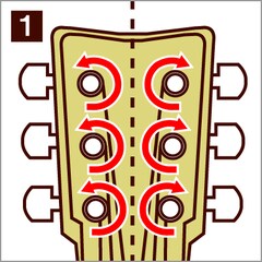 1. Before restringing the guitar, first confirm the direction to turn the pegs. The pegs for strings 1 through 3 are typically turned clockwise when looking from the front, while those for strings 4 through 6 are turned counterclockwise.