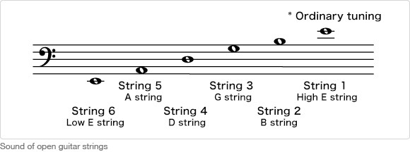 Moving from up to down (i.e. from thicker to thinner) result in an increasingly higher pitch. The diagram below shows ordinary tuning, which refers to the tone produced from each string when not held down with the left hand.