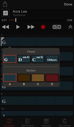 The tempo and key can be changed if desired for your practice or performance. You can even edit the chords to make your own arrangement of the song by choosing from two recommended chords or selecting the chord root and chord type. Use the peview button to audition your new chord arrangements!