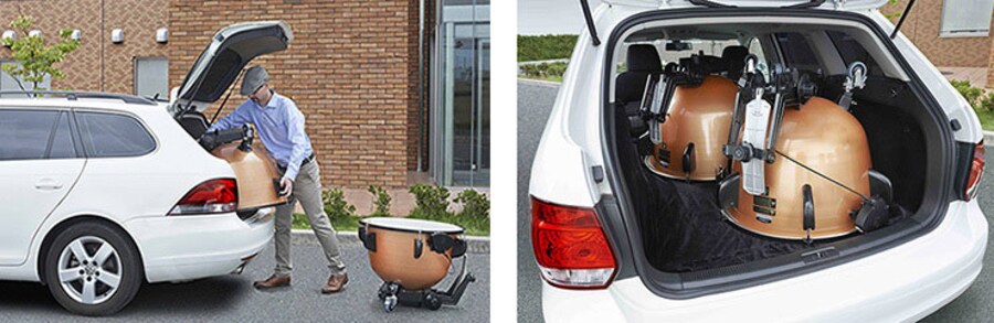 The lightweight aluminum bowls and the ease with which the pedals and legs can be retracted make the entire system conveniently compact and portable. [Overall size when folded for transport (W x D x H)] TP-3323: 73 x 82 x 60 cm, TP-3326: 80 x 85 x 60 cm, TP-3329: 88 x 89 x 63 cm, TP-3332: 95 x 93 x 63 cm