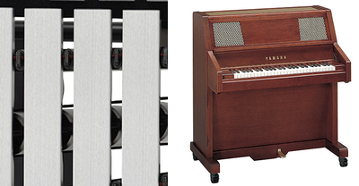 Compared to conventional damper mechanisms that use a pivoted damper arm, the damper mechanism in the new models moves perpendicularly to the natural and accidental tone bars and contacts them evenly for improved damping. The new mechanism is also safer, because parts that could catch fingers have been eliminated.