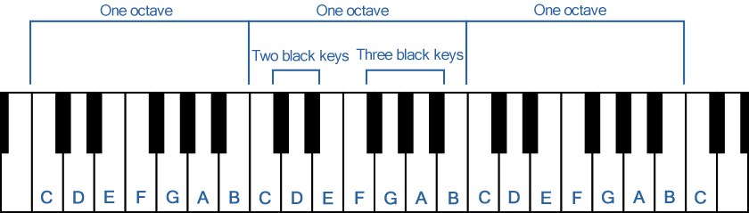 As shown in the diagram, the piano keyboard layout consists of a regular arrangement of white keys and black keys. Pressing a key causes a certain note to be produced. In the diagram, the white keys are labeled with their names in the musical alphabet and with their tonic names.
