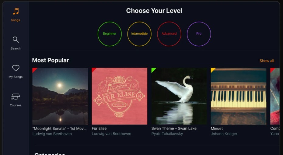 With up to 20 different genres to choose from, Flowkey has something for all beginners and tastes. Some of the available songs are: