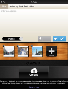 Piano Diary can also turn your MIDI recordings into audio. Simply add your favorite photos and Piano Diary will render your MIDI performance as audio to create your original slide shows. Upload the completed slideshow to YouTube so your friends and family can enjoy your performances!