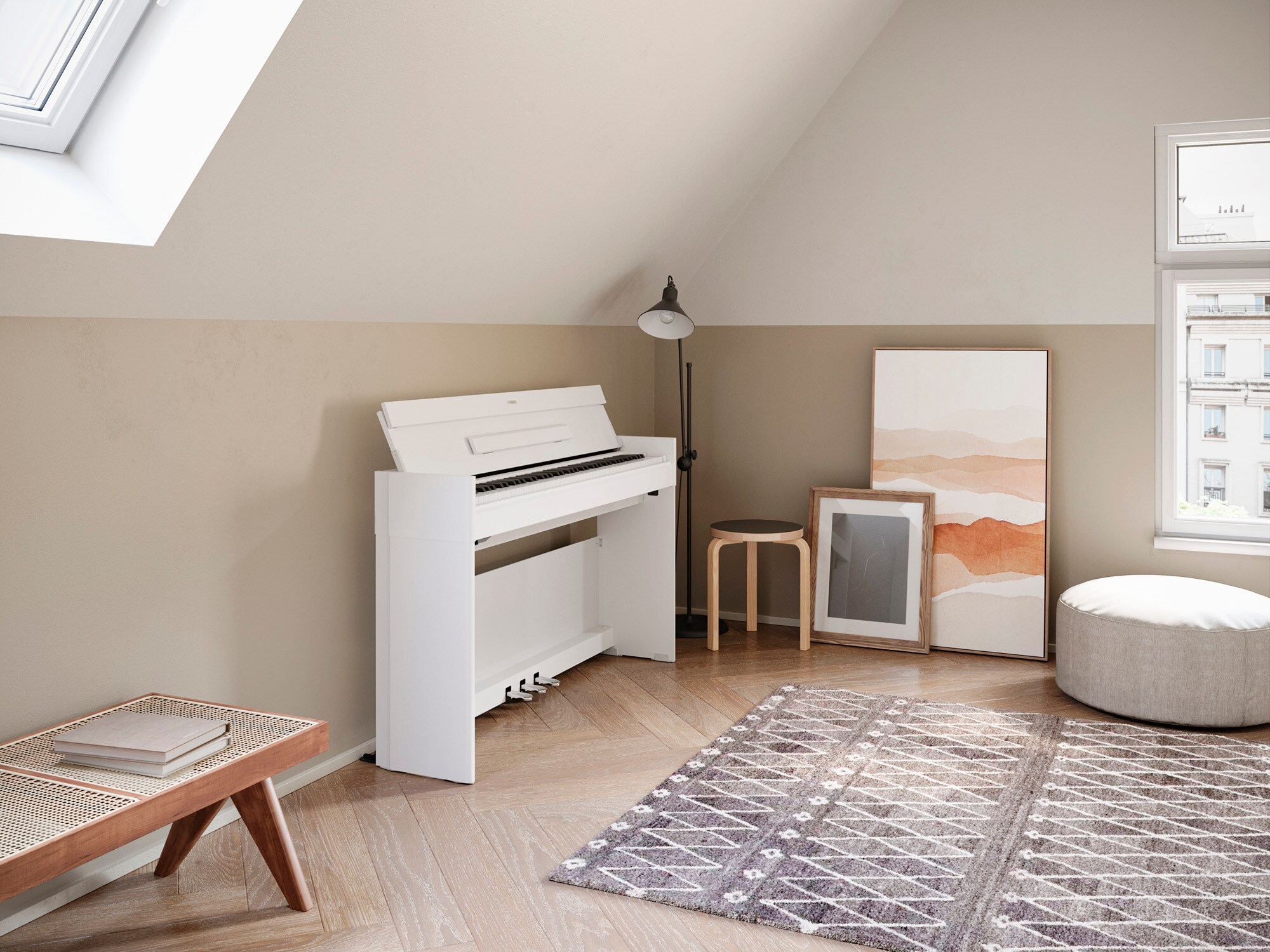 Standard size, 88-key model of the ARIUS digital piano featuring weighted keyboard. With Yamaha's CFX concert grand piano sound as a built-in Voice, experience a rich expressive playing feel with the GHS keyboard. Includes newly equipped ear-friendly functions, and compatibility with Yamaha’s Smart Pianist app.