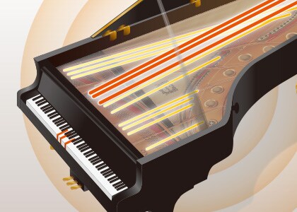 In a grand piano, strings and sounds resonate throughout the entire body of the instrument producing a rich reverberation that envelops the listener in sound. Not only are the strings you are playing vibrating, but other strings ring as a reaction to ones you play. This is one reason the piano's sound is so complex and rich.