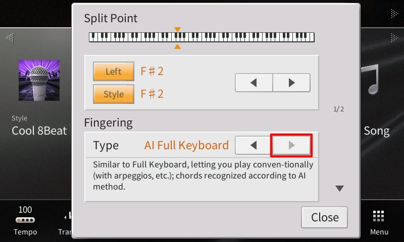 - Touch right arrow to select, Fingering Type - AI Full Keyboard.