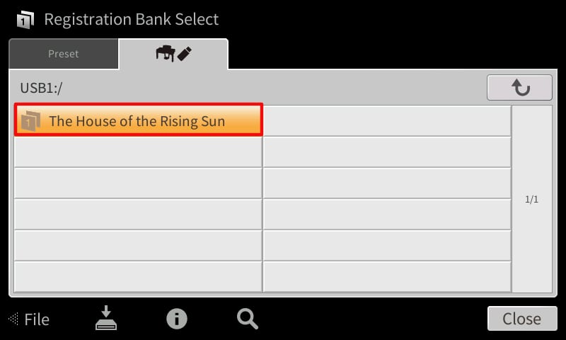 Now that this is saved to the USB, this registration data can be recalled at any time in the future but pressing the REGIST BANK - & + buttons together and selecting the registration saved. Then just press with Registration Memory 1 or Registration Memory 2 to load the setup.