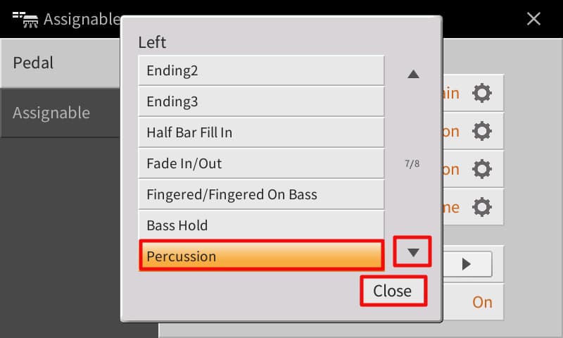 - Scroll down to page 7, touch Percussion, and Close.