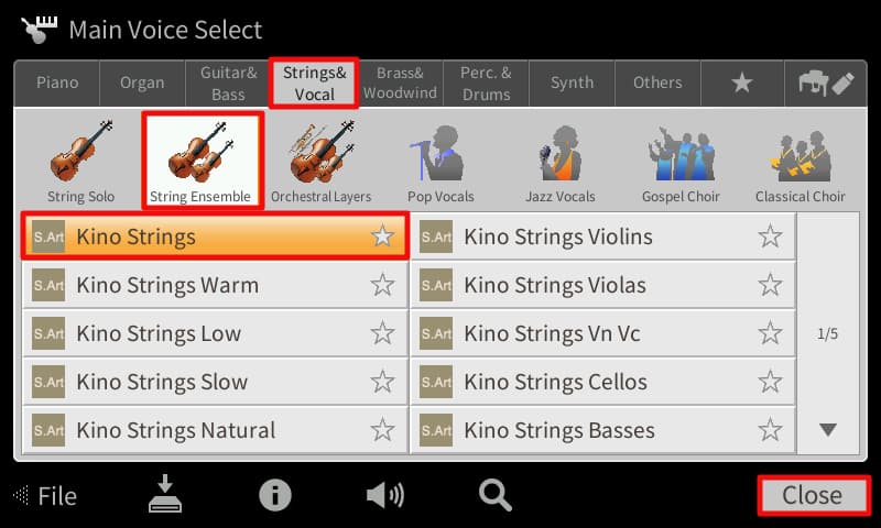 - Select String & Vocals in the Voice area, then under String Ensemble touch Kino Strings, and Close.