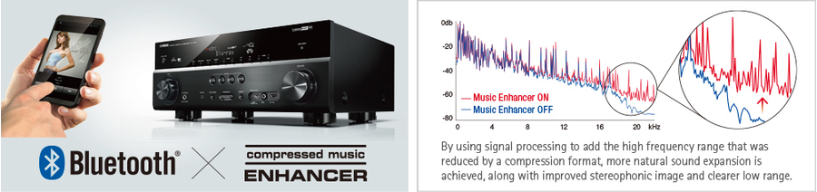 This AV receiver is equipped with Bluetooth functionality to let you enjoy easy wireless music playback from smartphones and other devices. Yamaha Compressed Music Enhancer is now optimised for Bluetooth audio transmission to ensure that your music will have vivid, lively sound quality even during wireless playback.