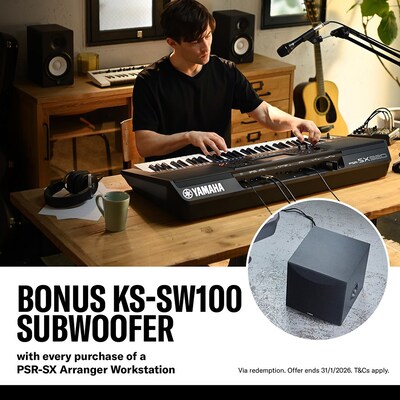 Elevate your music with Yamaha - where innovation meets inspiration, a recieve a bonus KS-SW100 Subwoofer with the purchase of your PSR-SX Arranger Workstation.