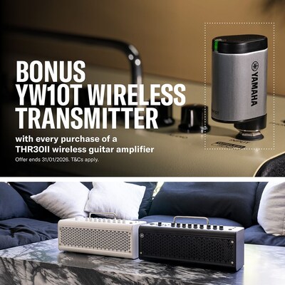 The Yamaha THR30II guitar amplifiers features realistic tube-amp tones, a built-in rechargeable battery, Bluetooth connectivity for audio playback, and for a limited time, a bonus YW10T wireless transmitter.