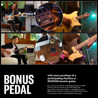 Get a bonus Line 6 HX ONE or Line 6 POD Express Guitar pedal, with a purchase of selected Pacifica and REVSTAR guitars.